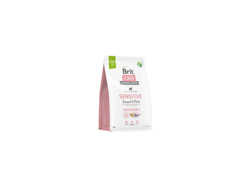 Brit Care Dog Sustainable Sensitive. Bezobilná receptura z udržitelných zdrojů surovin bohatá na hmyz a rybu pro citlivé psy a psy s intolerancí. Kompletní krmivo pro psy.