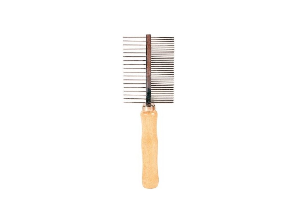 Kovový, oboustranný hřeben s dřevěnou rukojetí. Velikost: 17 cm.
