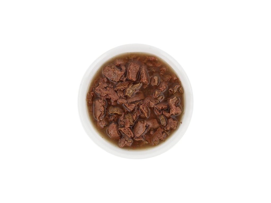 Složení: maso a vedlejší výrobky živočišného původu (kousky masa 88 %, z toho hovězí maso 11,6 %), minerální látky, hrachový škrob, slunečnicový olej, hrachová bílkovina, čekankový inulin 0,4 %, lignocelulóza