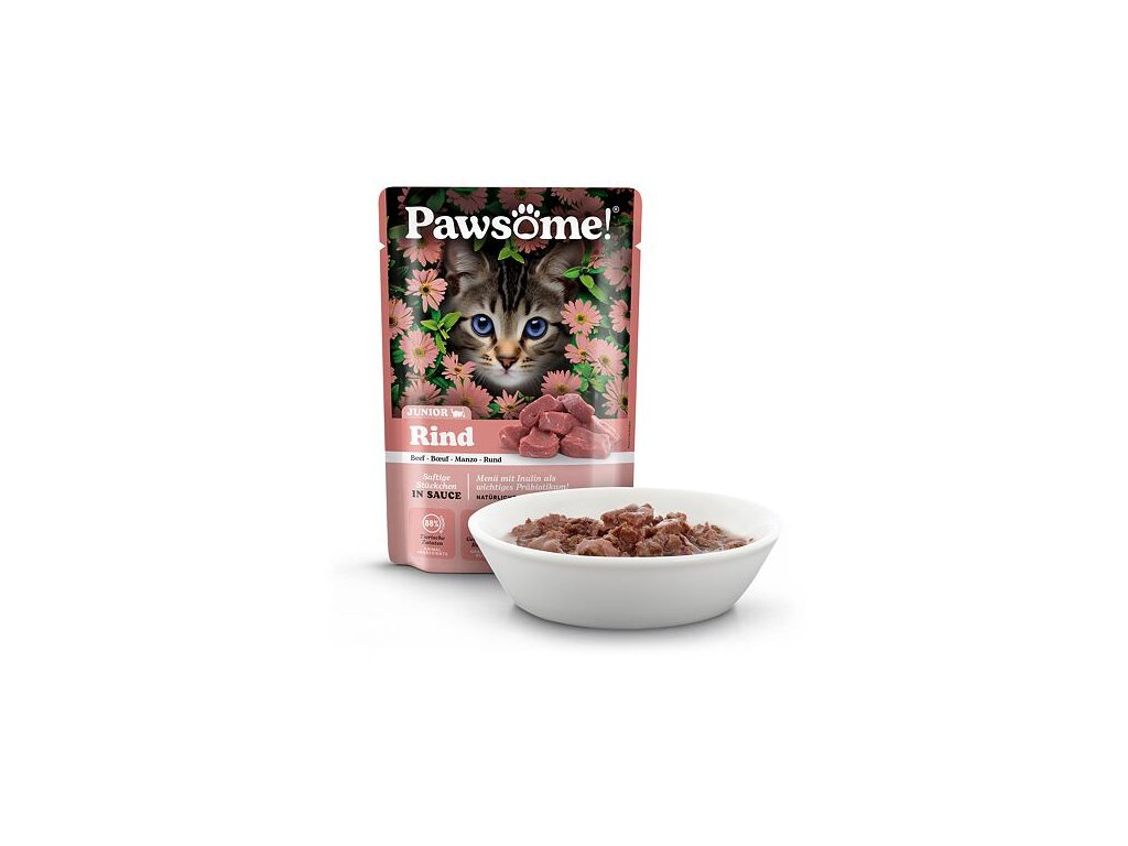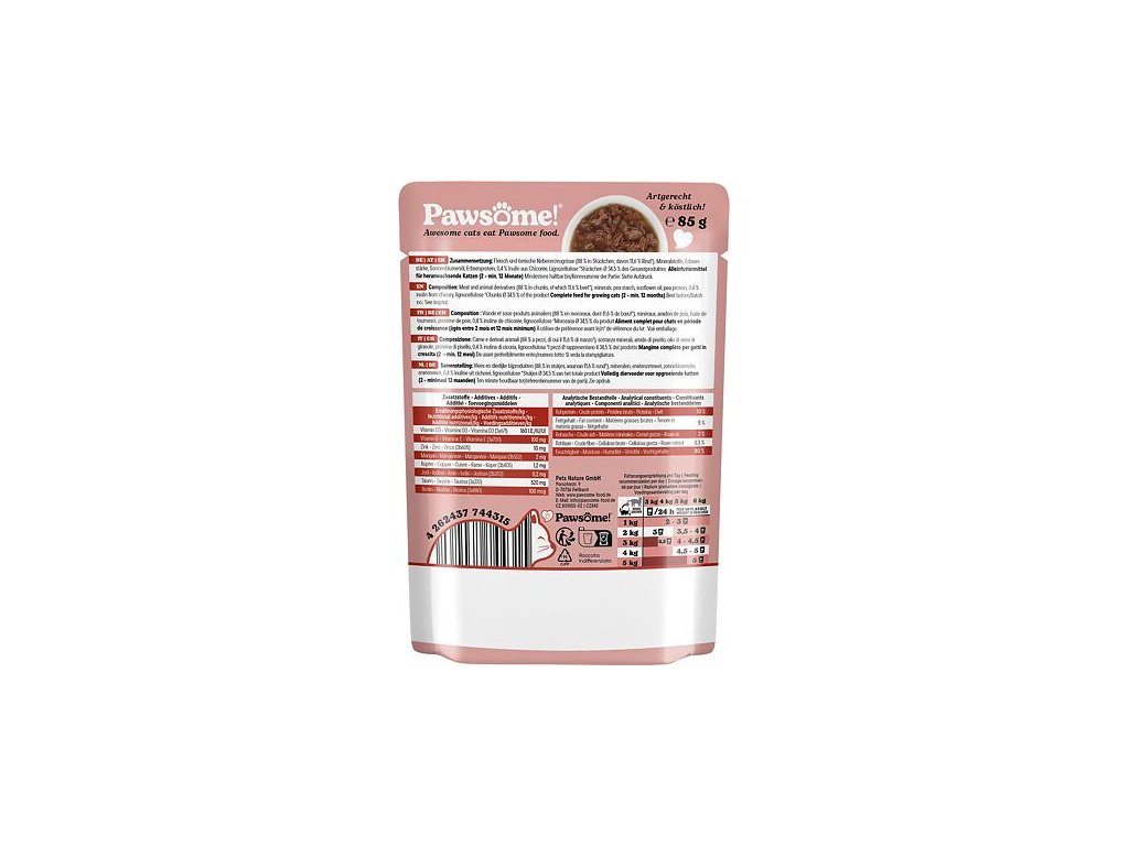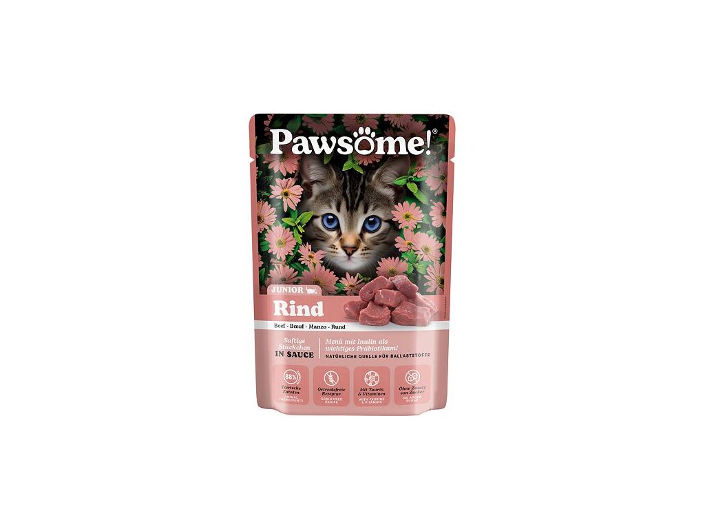 Šťavnaté měkké kousky s hovězím masem v lahodné omáčce jsou kompletním krmivem s vyváženým podílem bílkovin, tuků, vitamínů a minerálů, které přispívá ke zdravému vývoji a růstu mladých koček do 12 měsíců věku.Kočky jsou masožravci, a proto krmivo Pawsome! obsahuje velké množství živočišných bílkovin a nenajdete v něm obiloviny ani přidaný cukr – protože ani jedno do kočičí misky nepatří. Je vytvořeno tak, aby splňovalo očekávání i těch nejmlsnějších mazlíčků a zároveň zajišťovalo jejich zdraví, vitalitu a celkovou spokojenost. Jeho delikátní chuť, vůně a kombinace kousků masa a omáčky nabízí kočkám jedinečný chuťový zážitek a zároveň jim dodává živiny nezbytné pro jejich každodenní dobrodružství.